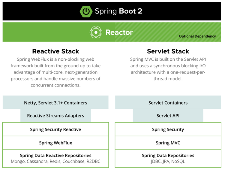 程序员往往根据不同的应用场景选择不同的技术,有的场景适合用于同步阻塞的,有的场景适合用于异步非阻塞的。而Spring 5提供了一整套响应式(非阻塞)的技术栈供我们使用(包括Web控制器、权限控制、数据访问层等等)。