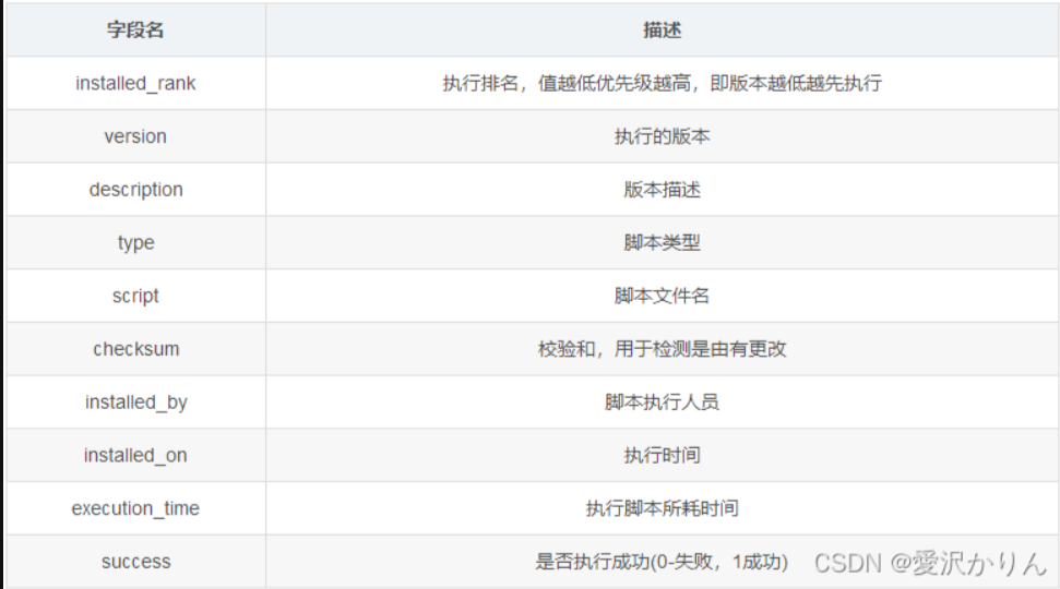 flyway会对每次执行过sql脚本保存到flyway_schema_history表中,在数据库中将保存sql脚本的版本号和对sql生成checksum,当下次执行数据库迁移的时候就会按照版本号从低往高执行。