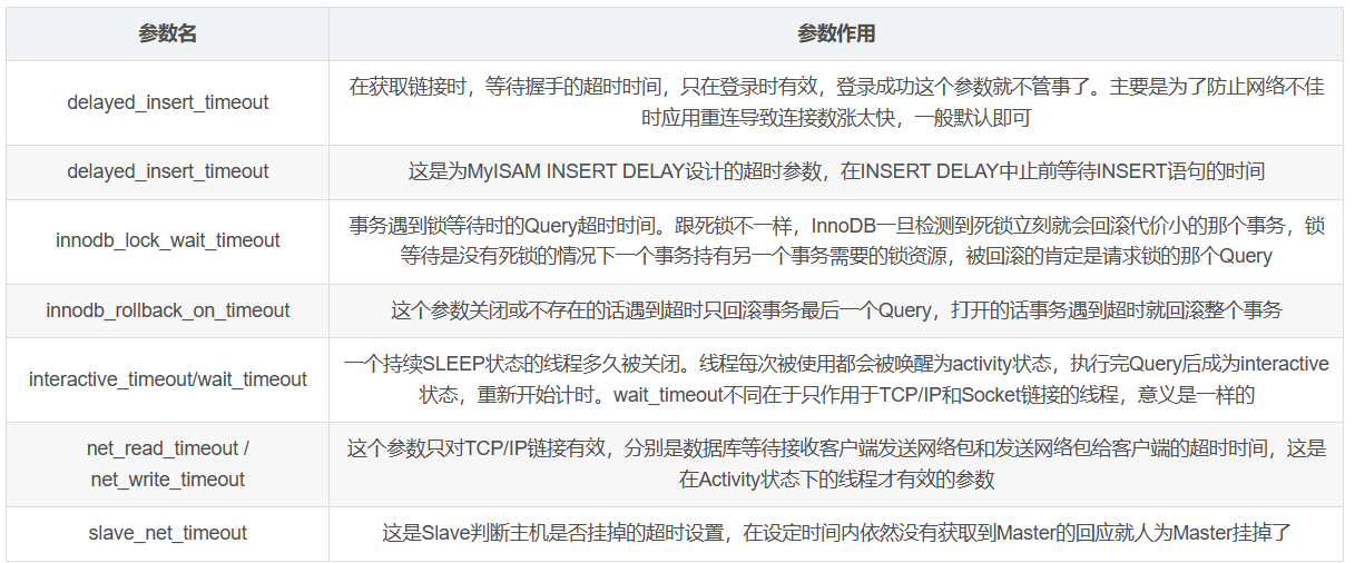 mysql> set global interactive_timeout=100;mysql> set global wait_timeout=30;