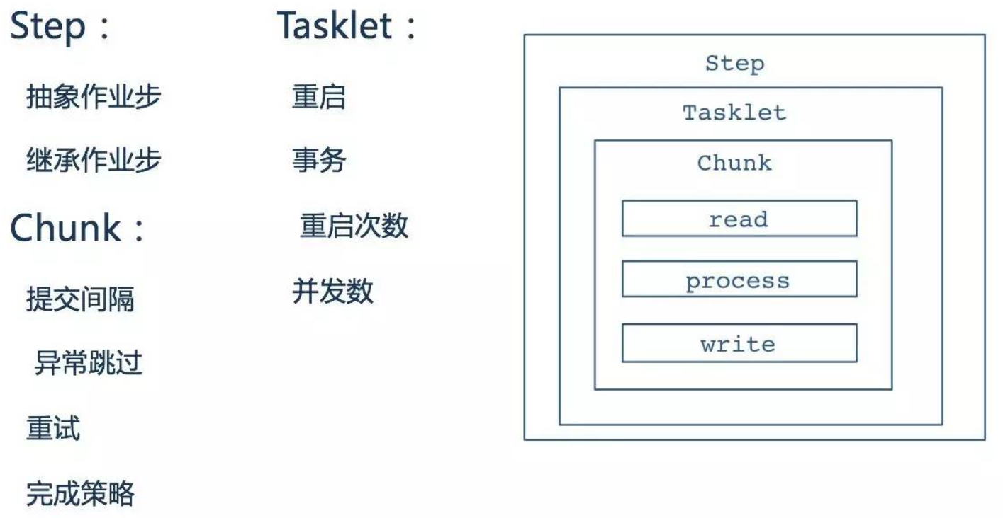 框架还为Step提供了重启、事务、重启次数、并发数;以及提交间隔、异常跳过、重试、完成策略等能力。