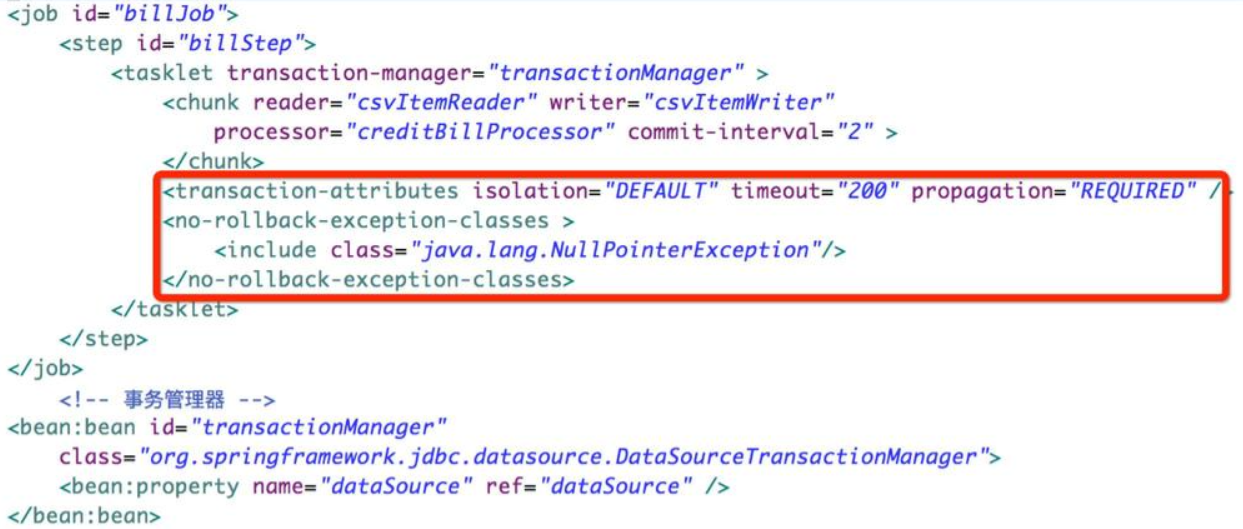 - 支持rollback和no rollback,通过skippable-exception-classes和no-rollback-exception-classes进行支撑;