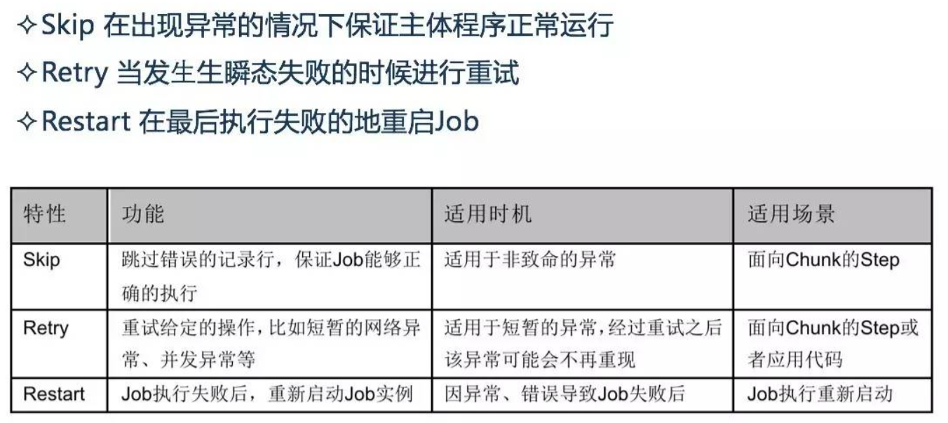 框架提供了支持上面所有能力的特性,包括Skip(跳过记录处理)、Retry(重试给定的操作)、Restart(从错误点开始重新启动失败的Job):