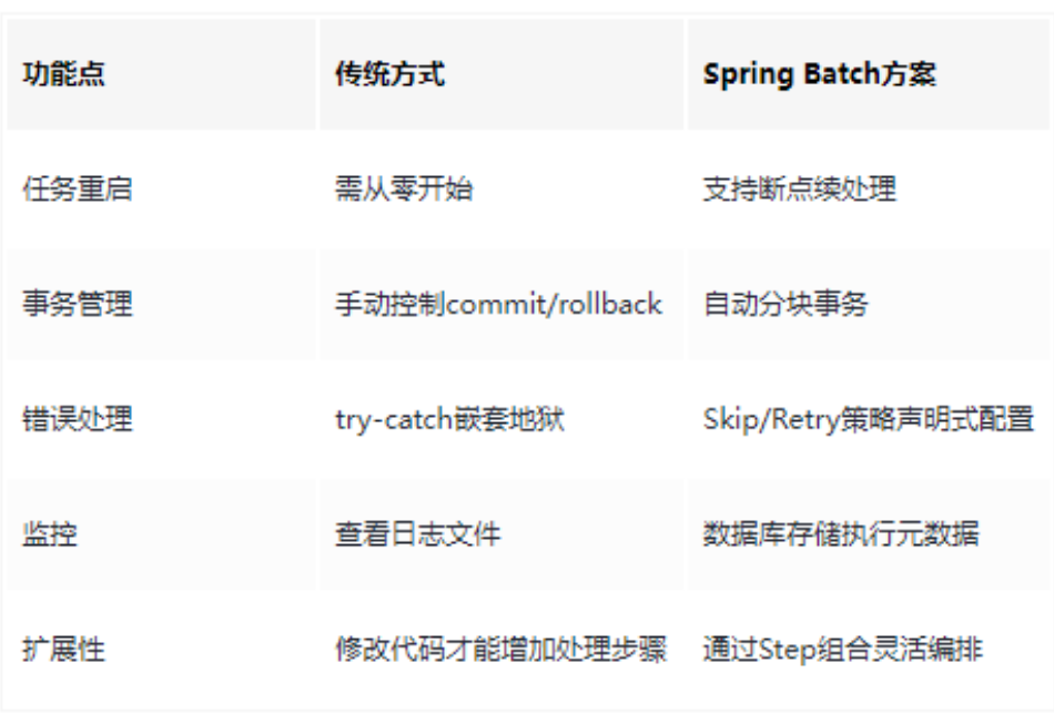 批处理要求Job必须有较强的健壮性,通常Job是批量处理数据、无人值守的,这要求在Job执行期间能够应对各种发生的异常、错误,并对Job执行进行有效的跟踪。