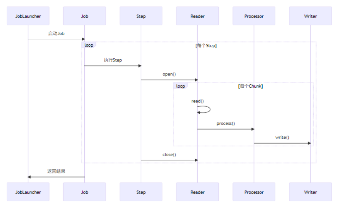 Step包含了一个实际运行的批处理任务中的所有必需的信息,其实现可以是非常简单的业务实现,也可以是非常复杂的业务处理,Step的复杂程度通常是业务决定的。